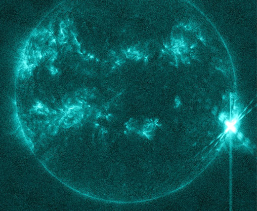 Sunspot AR3664 just unleashed the strongest solar flare of the current solar cycle–an X8.7-category blast from beyond the sun’s western limb. X marks the spot in this image of the flare from NASA’s Solar Dynamics Observatory.