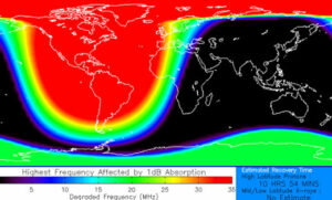 Red zones in the map show where shortwave radio signals are being absorbed. Inside the Arctic Circle, frequencies below 30 MHz are almost completely blacked out, a nuisance for polar aviators and ham radio operators.